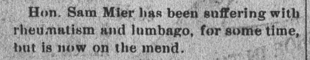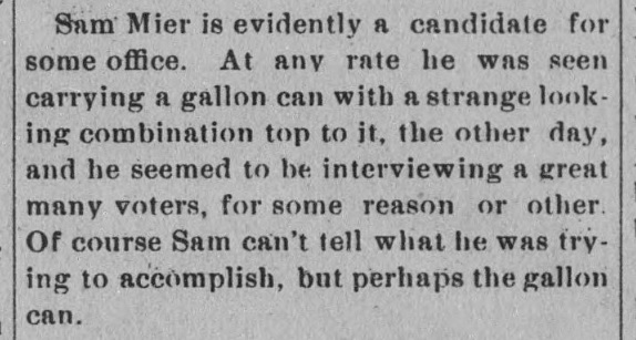 1893: The following item is from the April 20, 1893 issue of the "Somerset County Star" newspaper. The humorous tenor of the article suggests that Samuel Mier was a well-loved local character.