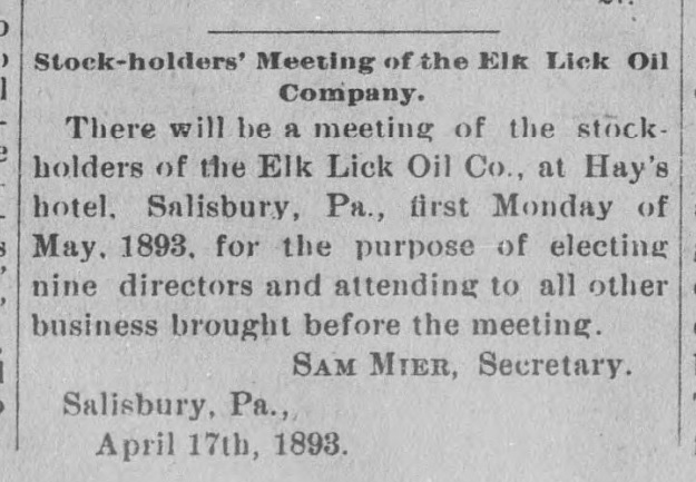 1893: The following item is also from the April 20, 1893 issue of the "Somerset County Star" newspaper. In this item, Samuel Mier announces a meeting of the Elk Lick Oil Company.