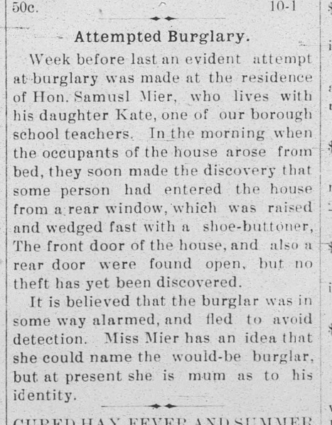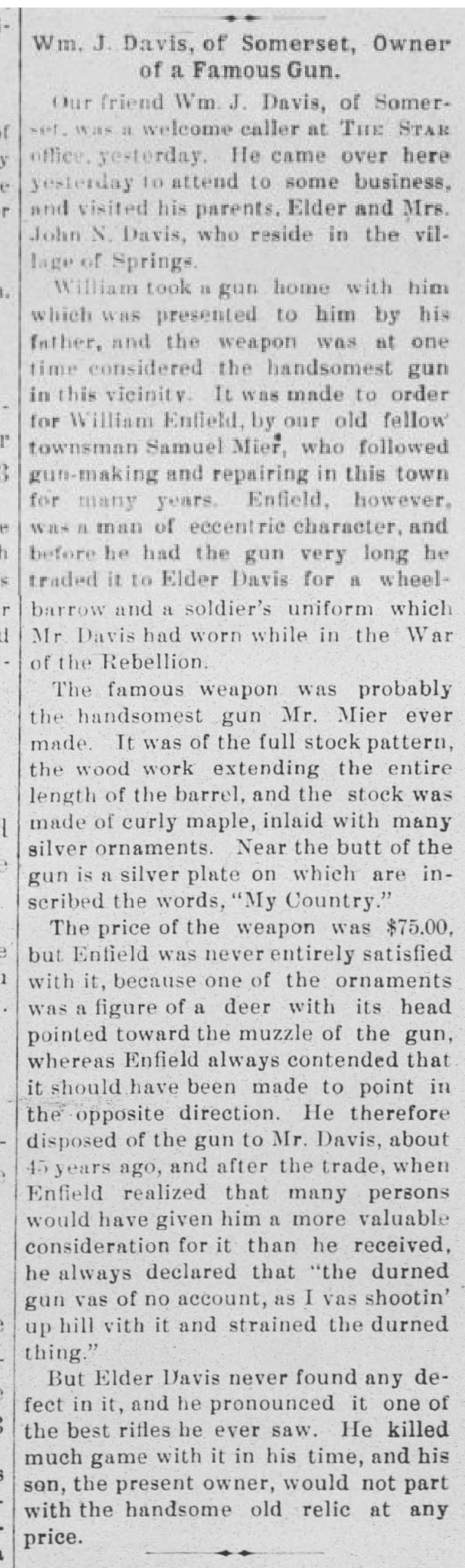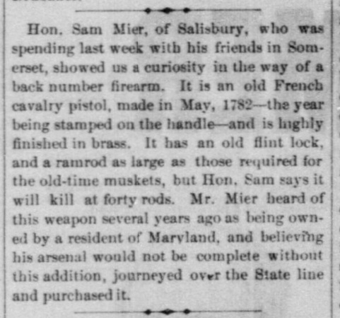 1889: The following is from the April 3, 1889 issue of the "Somerset Herald". It suggests that Samuel Mier may be a gun collector.