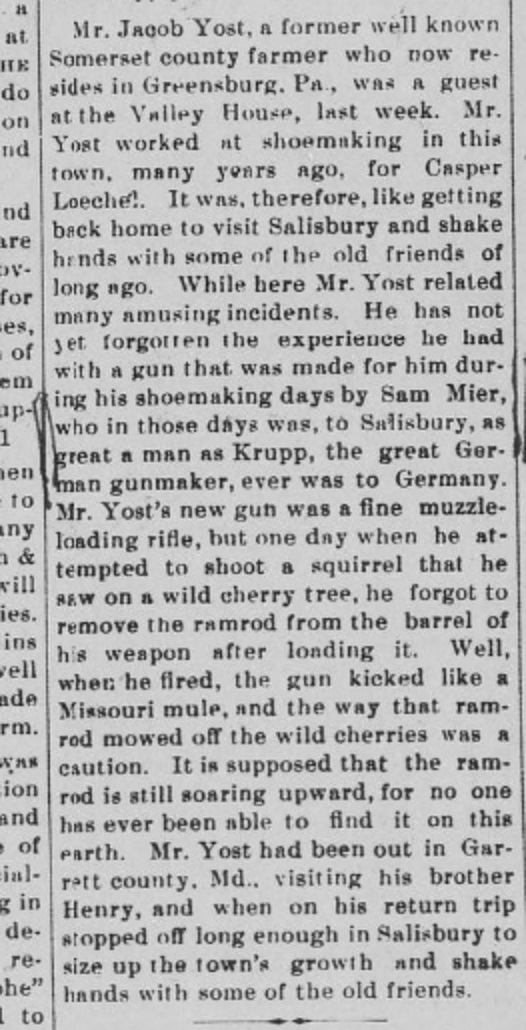 1907: The following item is from the June 6, 1907 issue of the "Somerset County Star" newspaper. It describes the time Jacob Yost forgot to remove the ramrod before shooting his Mier rifle at a squirrel.