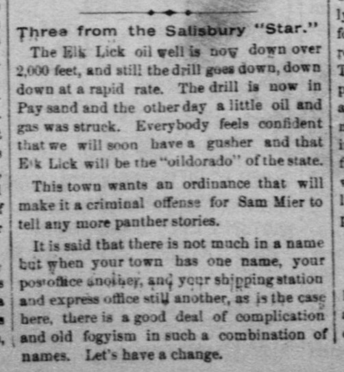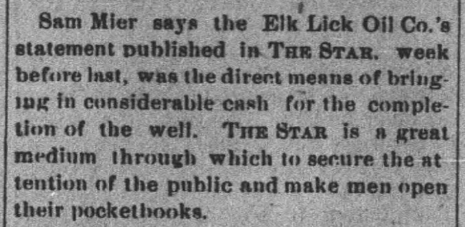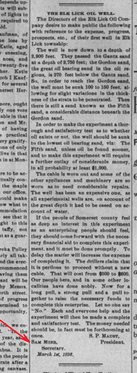 1892: The following item is from the March 3, 1892 issue of the "Somerset County Star" newspaper. It announces progress on the Elk Lick Oil Well, and solicits additional funds to continue the project.