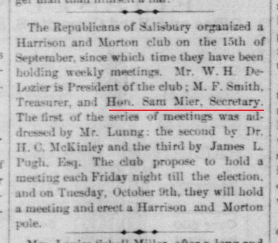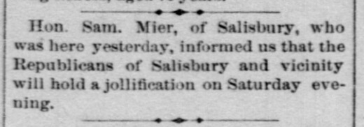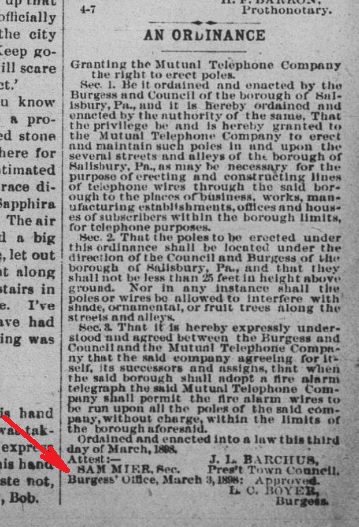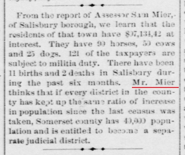 1883: The following is from the February 28, 1883 issue of the "Somerset Herald". It identifies Samuel Mier as the Auditor of Salisbury Borough.