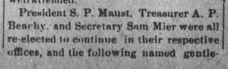 1892: The following item is from the May 5, 1892 issue of the "Somerset County Star" newspaper. It announces that Samuel Mier was re-elected as Secretary.