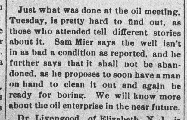 1892: The following item is from the September 1, 1892 issue of the "Somerset County Star" newspaper. It shows that Samuel Mier was supervising the drilling of the oil well.