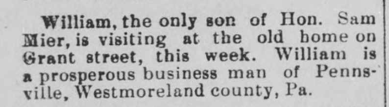 1888: The following is from the February 29, 1888 issue of the "Somerset Herald". It indicates that Samuel Mier is visiting the town of Somerset, Pennsylvania.
