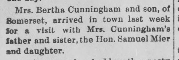 "Mrs. Bertha E. Cunningham, aged 69, died Wednesday morning at 3:30 o'clock at her home on West Main Street, Somerset. She was a daughter of Samuel and Harriet (Smith) Mier, both deceased. She is survived by one son, E. Allen Cunningham, of Somerset, and a sister, Mrs. Catherine Boucher, of Bedford, Pa.