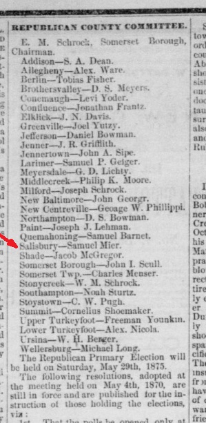 1875: The following clipping is from the April 21, 1875 issue of the "Somerset Herald". It identifies Samuel Mier of Salisbury, Pennsylvania as a member of the 1875 Somerset County Republican Committee.