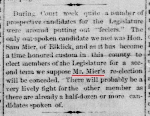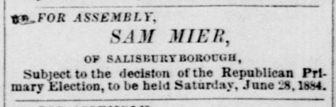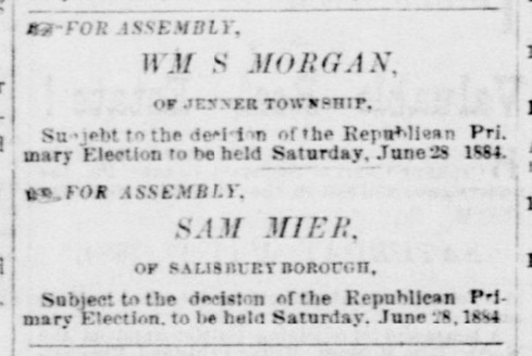 1884: The following is from the April 30, 1884 issue of the "Somerset Herald". It indicates that Samuel Mier is running for the Pennsylvania Assembly.