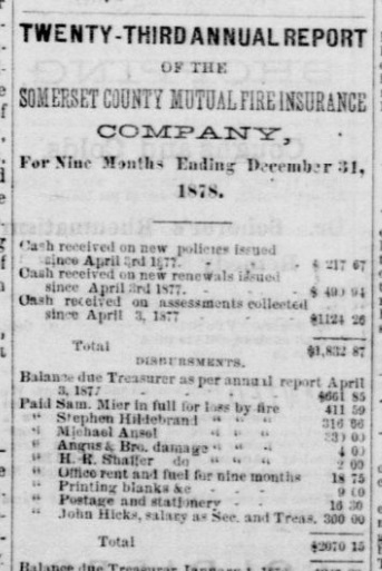 1878: The following is from the February 13, 1878 issue of the "Somerset Herald". It identifies a fire loss suffered by Samuel Mier. A 1935 newspaper article, included below, indicates that his gunshop burned to the ground around this time.