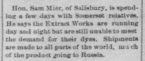 1899: The following is from the February 22, 1899 issue of the "Somerset Herald". It mentions Samuel Mier in connection with a Dye factory.