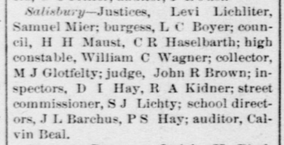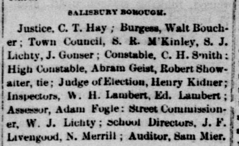 1890: The following clipping is from the February 26, 1890 issue of the "Somerset Herald". It shows that Samuel Mier has been elected as Burgess of Salisbury, Pennsylvania.