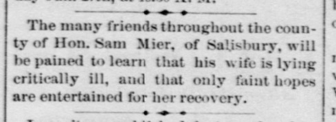 1896: The following is from the January 22, 1896 issue of the "Somerset Herald". It indicates that the wife of Samuel Mier is critically ill, and not expected to recover.