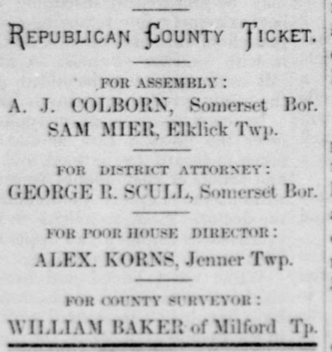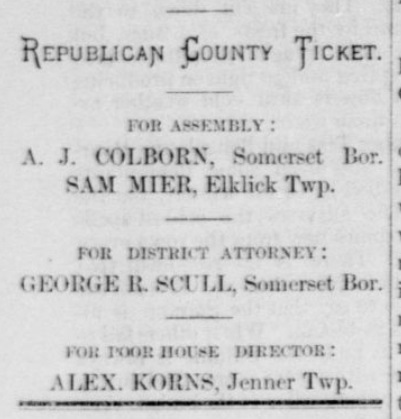 1880: The following is from the June 30, 1880 issue of the "Somerset Herald". It shows that Samuel Mier is running for the Pennsylvania Assembly, and Alexander Korns is running for the office of Director of the Poorhouse in Jenner Township.