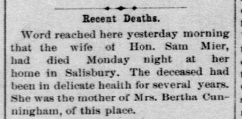 1896: The following is from the June 10, 1896 issue of the "Somerset Herald". It indicates that Samuel Mier's wife died.