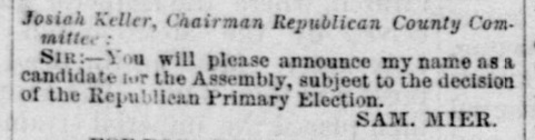 1880: The following item is from the June 16, 1880 issue of the "Somerset Herald". In this item, Samuel Mier announces his candidacy for the Pennsylvania Assembly.