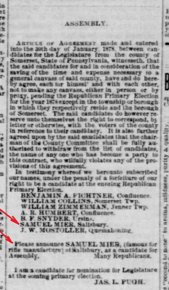 1878: The following clipping is from the March 27, 1878 issue of the "Somerset Herald". It identifies "SAMUEL MIER, (famous for rifle manufacture) of Salisbury, as a candidate for Assembly." The same notice appeared in the May 1, 1878 issue.