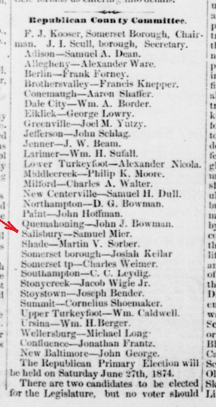1874: The following clipping is from the May 13, 1874 issue of the "Somerset Herald". It identifies Samuel Mier of Salisbury, Pennsylvania as a member of the 1874 Somerset County Republican Committee.
