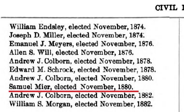 1880: The following excerpt is from the 1884 book "History of Bedford, Somerset and Fulton Counties, Pennsylvania". It indicates that Samuel Mier was elected as a State Representative in 1880.