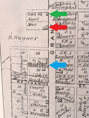The following image from the 1876 "County Atlas of Somerset Pennsylvania" has been annotated with green, red, and blue arrows to show the gun shop, residence, and foundry mentioned in the preceding article.