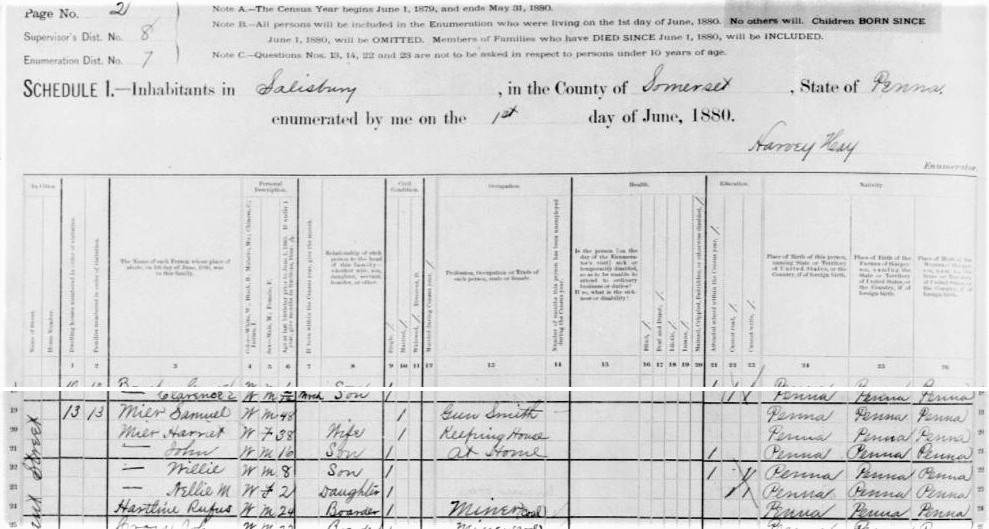 1880: In the 1880 census of Salisbury, Samuel Mier is enumerated as a 48-year-old gunsmith living with his wife Harriet, a two-year-old daughter Nellie, an eight-year old son Willie, a 16-year-old son John, and two coal mining boarders.