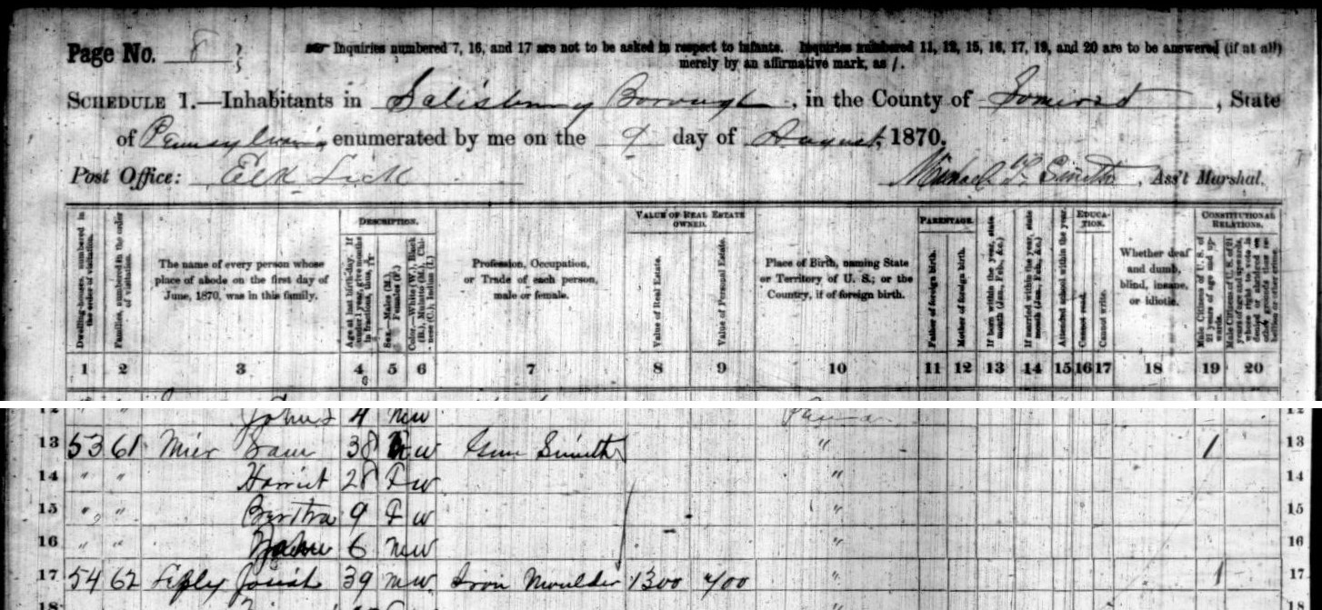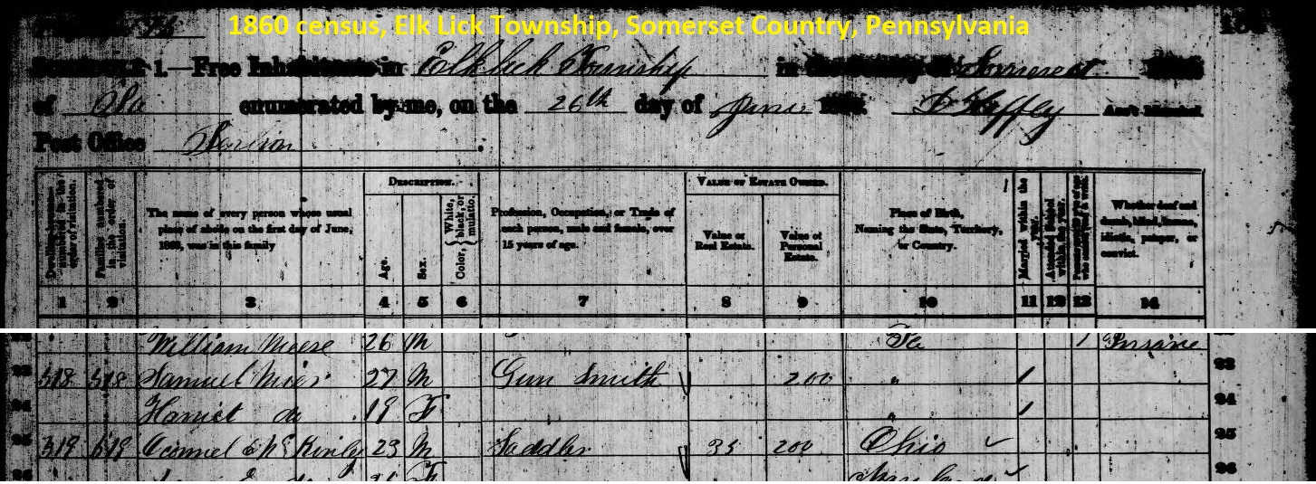 1860: In the 1860 census of Elk Lick Township, Somerset County, Samuel Mier is enumerated as a 27-year-old gunsmith with a 19-year-old wife Harriet.