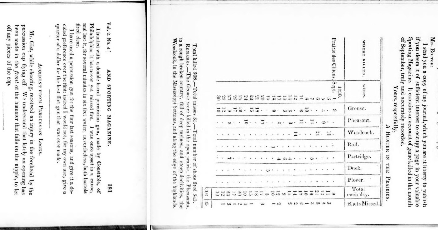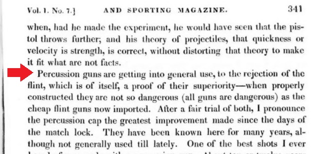 1825: In a section titled "On Gunnery" in the October 8, 1825 issue of the "American Mechanics' Magazine" (Broadway, New-York) William E. Wightman wrote the following about the advantages of percussion ignition:"The percussion lock has every advantage over the flint lock, namely, there is a less liability of accident by it, not being necessary to prime before loading, and the cock may be always kept on the cap except at the moment of firing, which prevents the gun going off at half cock; and if the gun is brought home loaded, by taking off the cap (which is the priming) there is no danger of its being fired by the foolishness of servants or others; and it is a fact, known to every observer of the percussion gun, that they kill at ten yards farther than a flint gun, and that about one quarter less powder is used for a charge, owing to the complete and instantaneous combustion of the whole charge of powder; and that there is no loss of force through the touch hole, as in flint guns; and also, that they receive the additional strength of the priming."