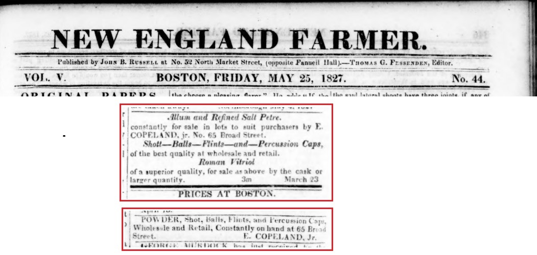 1827: E. Copeland, Jr. ran two advertisements in the May 25, 1827 issue of the "New England Farmer" newspaper (Boston) that offered both flints and percussion caps for sale.