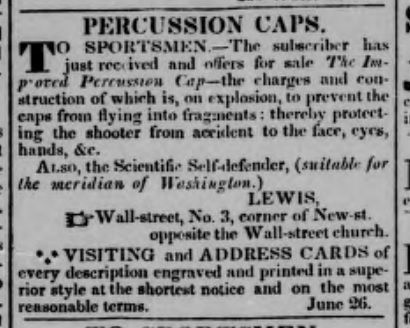 1832: Two advertisements in the July 28, 1832 issue of the "Spirit of the Times and Life in New-York" newspaper relate to the percussion system. An advertisement by Hinton's Warehouse & Manufactory offers flint and percussion rifles, percussion caps, and flints for sale, and also offers the service of "Flint locks percussioned". An advertisement by Lewis is titled "Percussion Caps" and "offers for sale The Improved Percussion Cap — the charges and construction of which is, on explosion, to prevent the caps from flying into fragments: thereby protecting the shooter from accident to the face, eyes, hands, &c." The Lewis advertisement is repeated in the September 1, 1832 issue.