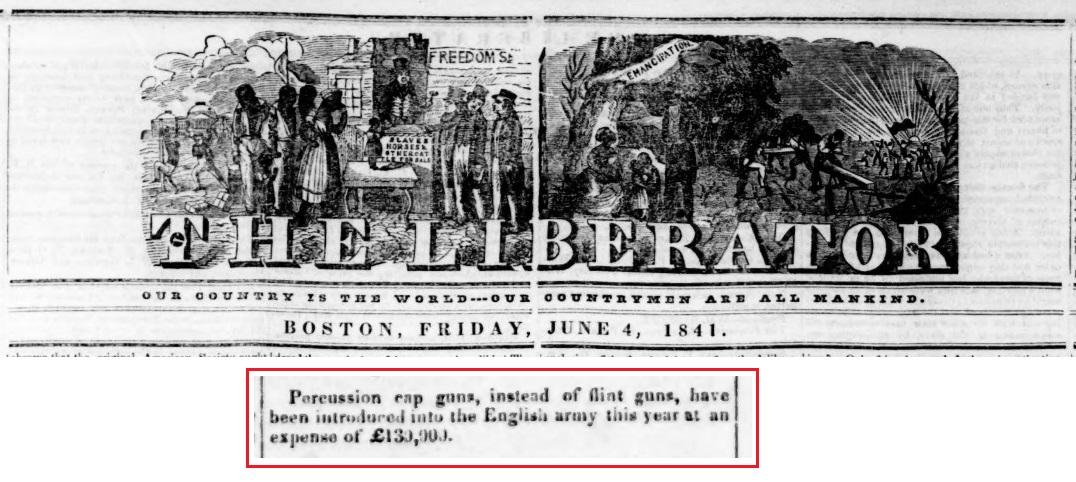 1841: The June 4, 1841 issue of "The Liberator" (Boston) includes the statement, "Percussion cap guns, instead of flint guns, have been introduced into the English army this year..." That statement may be based on a similar statement in the May 15, 1841 issue of "The Albion or British, Colonial, and Foreign Weekly Gazette" (New York).