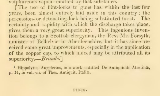 1826: In the following excerpt from the third edition of Hawker's book "Instructions to young sportsmen in all that relates to guns and shooting" (London: 1826), Hawker states, "...this is one of the reasons the percussion plan has so rapidly superseded the flint." The same statement is repeated in the 1830 edition.