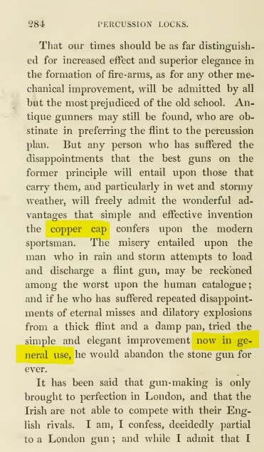 1832: Volume 1 of the 1832 British book "Wild Sports of the West" indicates that guns using copper caps are "now in general use" and mentions the benefit of using percussion versus flintlock firearms in wet and stormy weather.