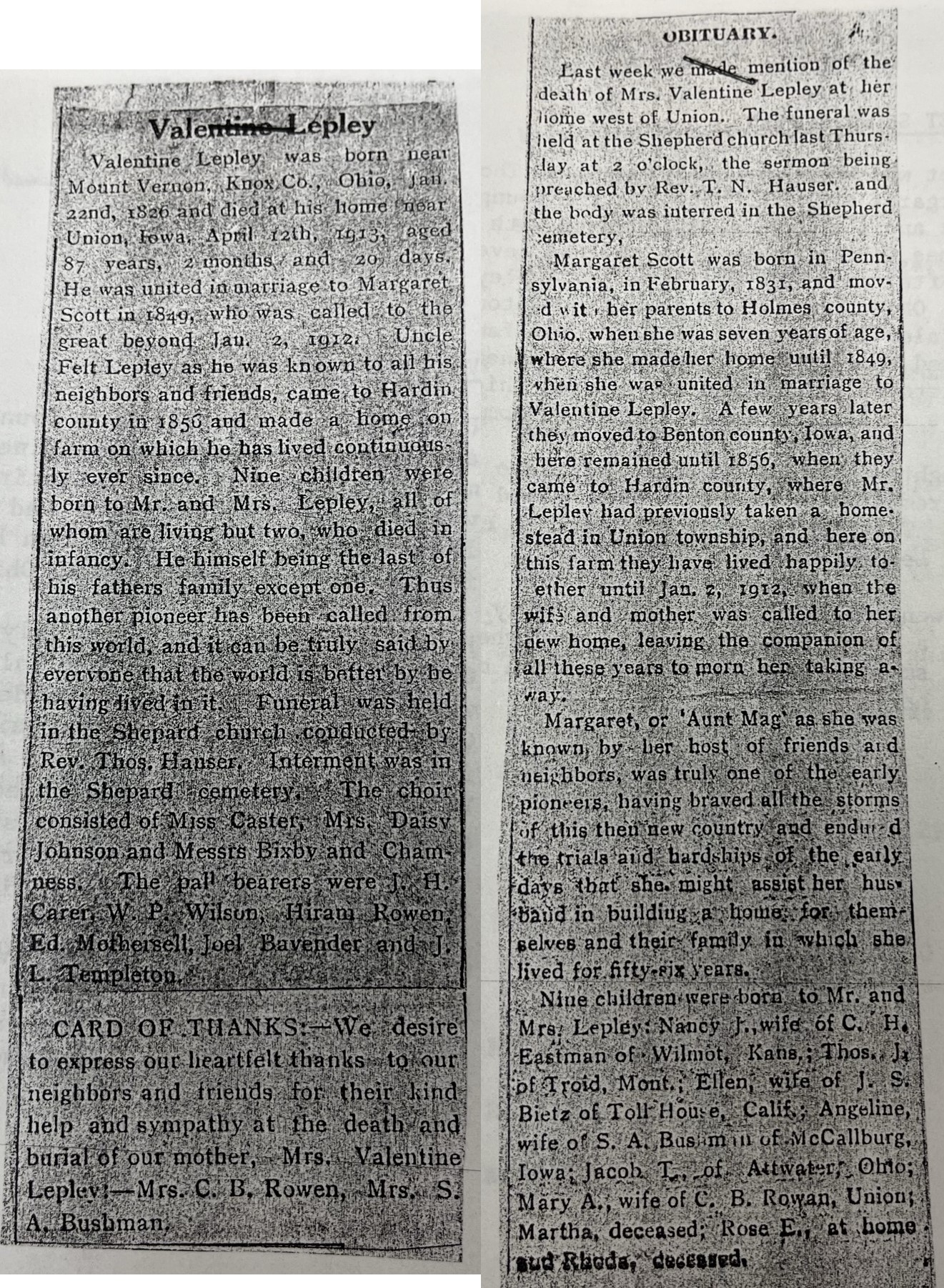 1913: Valentine Lepley died in 1913 and is also buried in the Sheppard Cemetery in Hardin County, Iowa. The top of his tombstone states, "LEPLEY" and the front states,"VALENTINE 1826-1913 MARGARET HIS WIFE 1831-1912". Click here to see the obituaries of Valentine and Margaret Lepley.