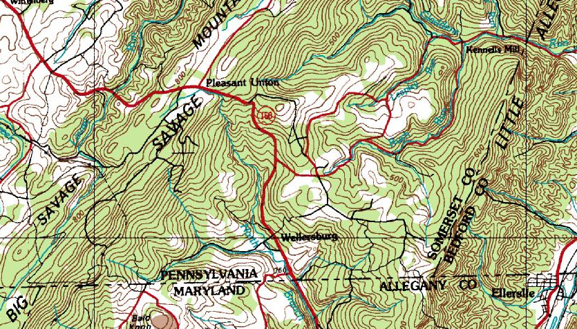 On this USGS map, lot 3356 of Michael Corn is located where the "G" is in the words "ALLEGHANY CO.", just below the southeast corner of Somerset County. This shows that lot 3356 is on a moderately sloping area just west of the steep western face of the Little Allegheny Mountain.