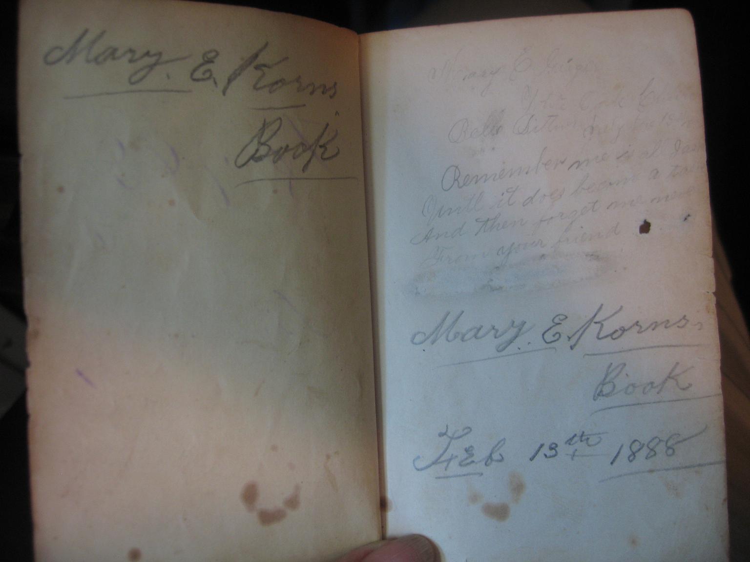 In October, 2015, Estalene (Korns) Dietle was reading in an old Bible she has. Tucked inside the Bible were these pages from an 1875 book that her grandmother Mary Elizabeth (Geiger) Korns owned, and signed in 1888. Mary would have been 20 years old at the time she signed the book.