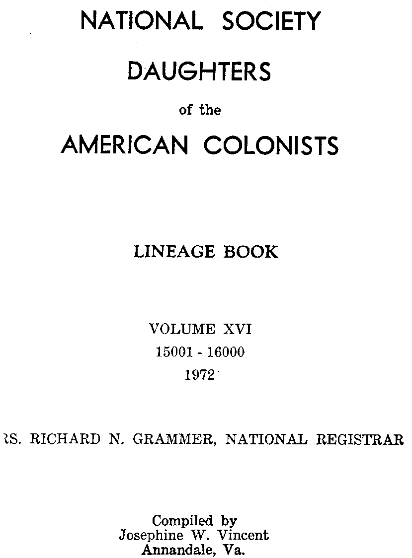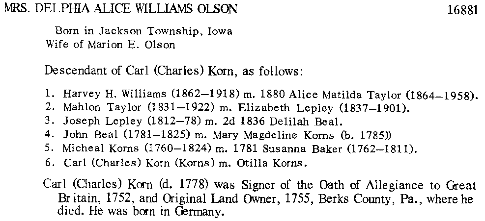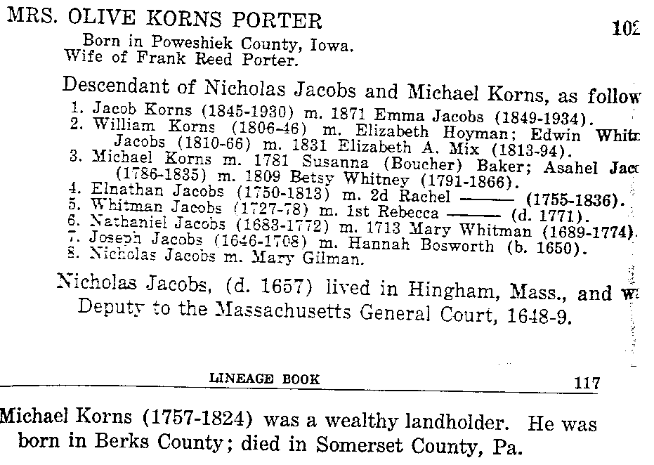 Lineages: Example volume cover Olive Korns Porter Edith Whelan Wharton Bessie Pearle Gaumer Alberta Bruce Dull Delphia Alice Williams Olson Click here for all six of the above pages in a single 123 KB PDF file. Return to Korns family home page