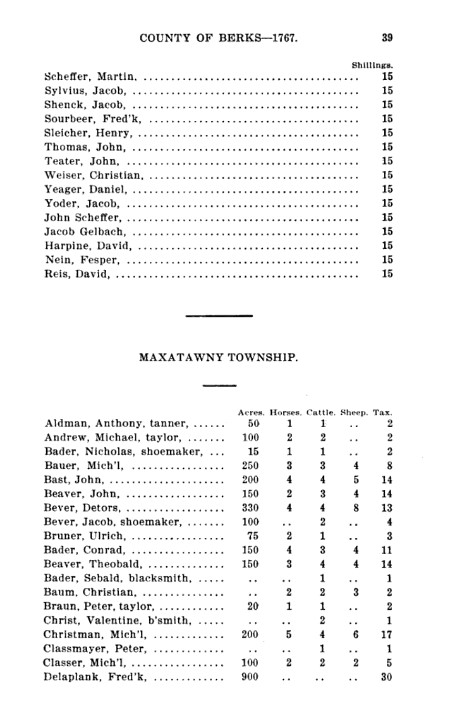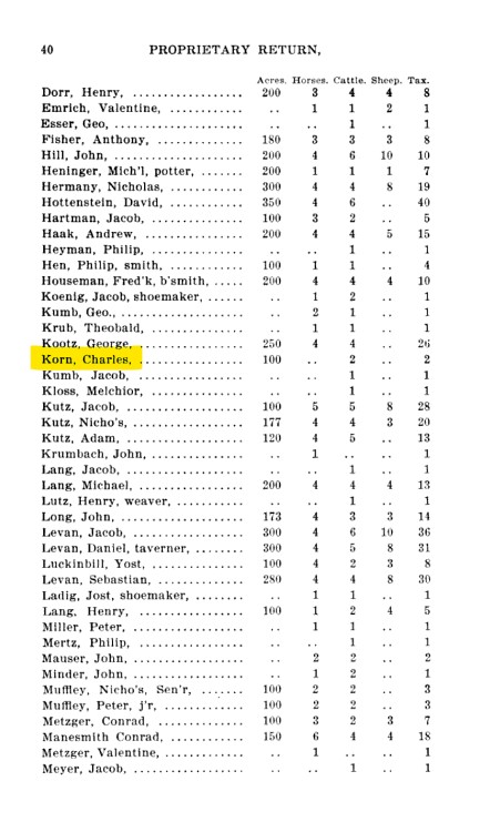 The following transcript shows Charles Korn in the 1767 Proprietary Return, Maxatawny Township, Berks County, Pennsylvania.