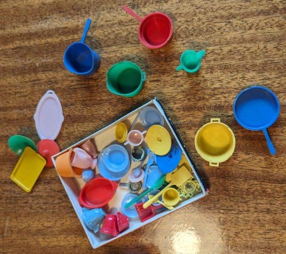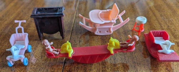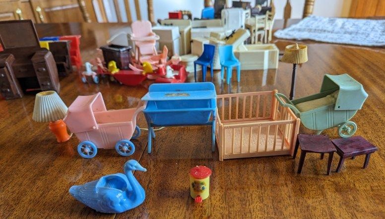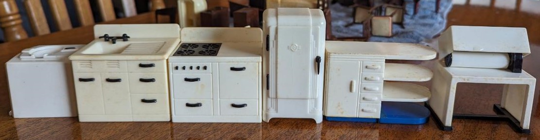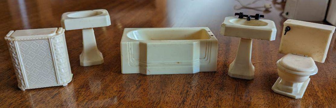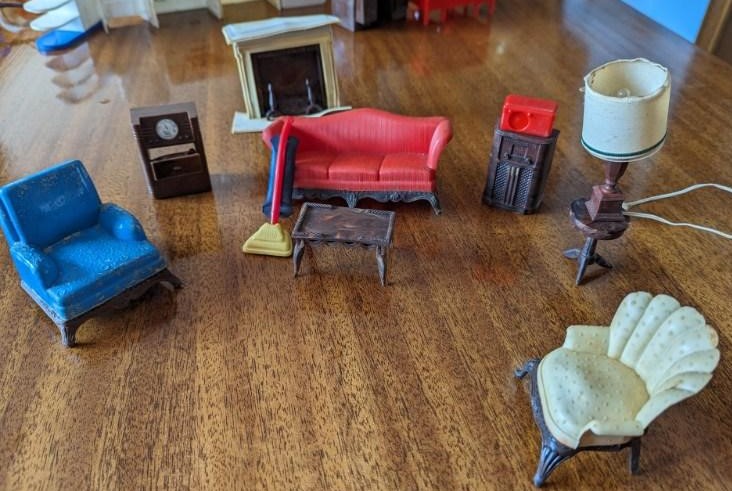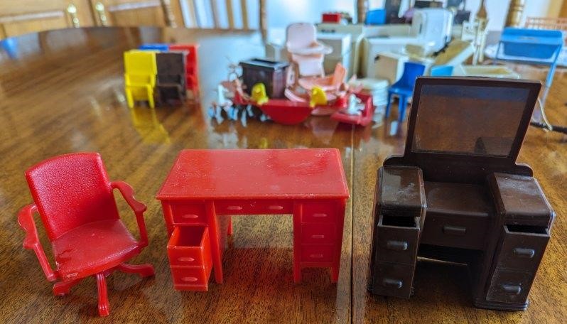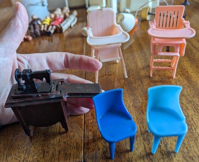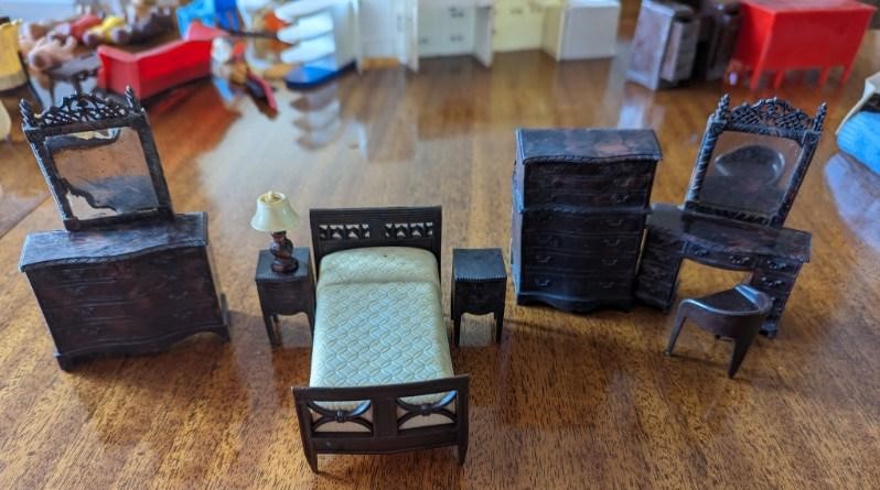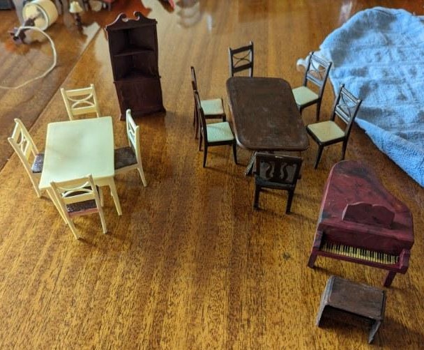 The following pictures, which were provided by Dana (Dietle) Moore, show the childhood doll furniture of Estalene (Korns) Dietle, and the box they have been stored in at least as far back as the 1950s.