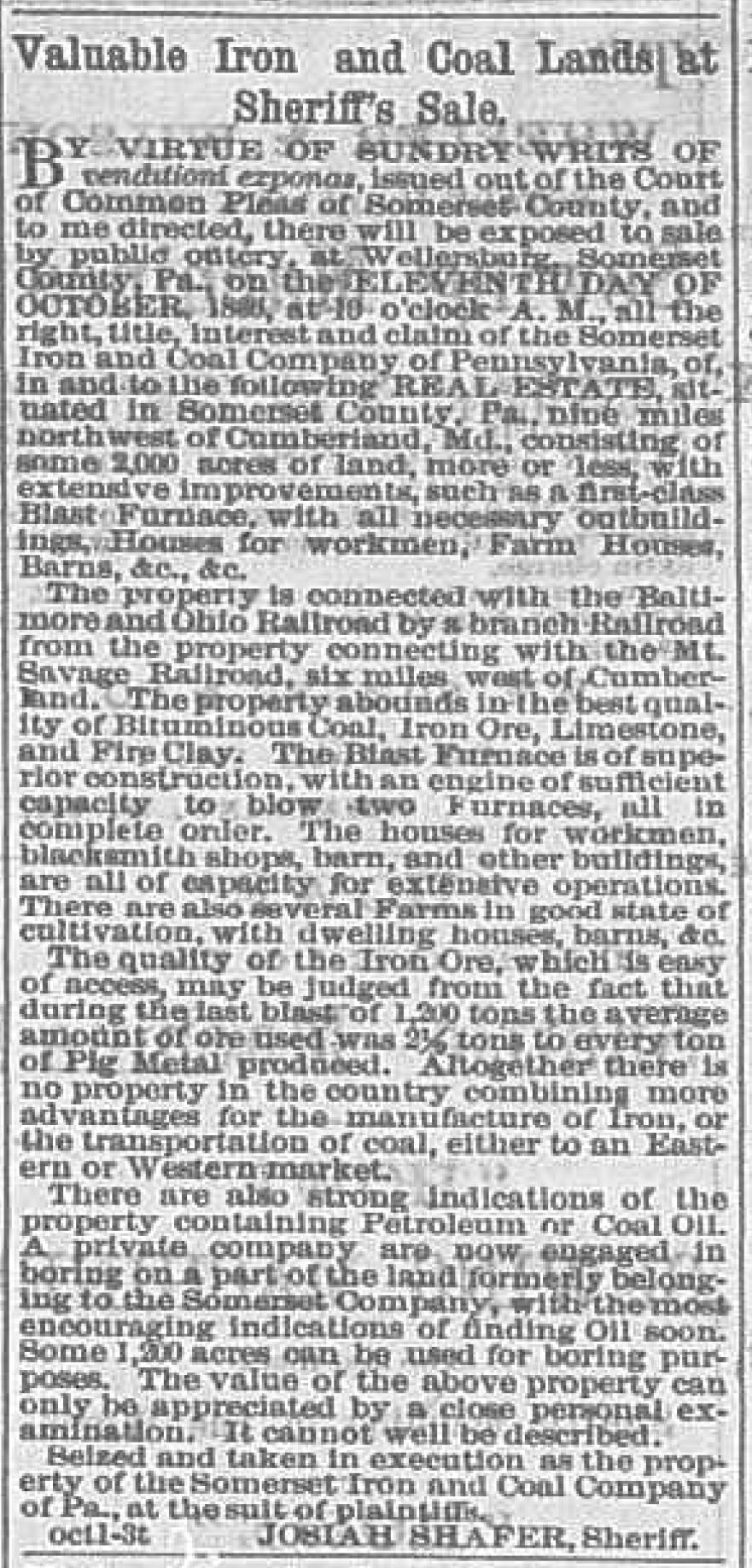 An advertisement in the October 3, 1866 "Wheeling Intelligencer" regarding a sheriff's sale of the property of the Somerset Iron and Coal Company of Pennsylvania indicates that the furnace was still functional, mentioning "a first-class Blast Furnace" and stating: "The Blast Furnace is of superior construction, with an engine of sufficient capacity to blow two Furnaces, all in complete order."